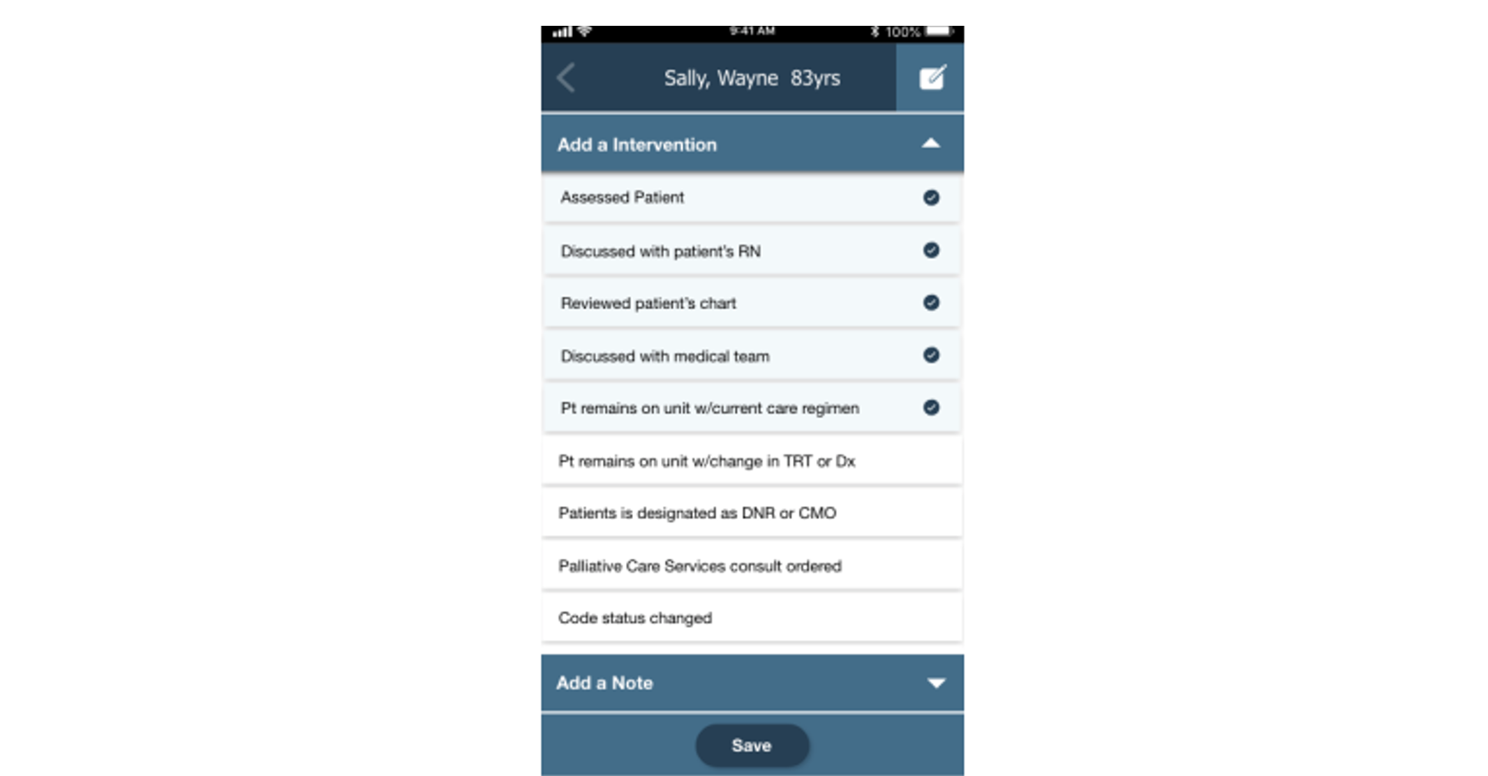 If enabled, select the “notepad/pencil” icon to enter a new note or intervention can be accessed from any page within the Patient Specific View. To add a new entry, tap the icon in the header.
